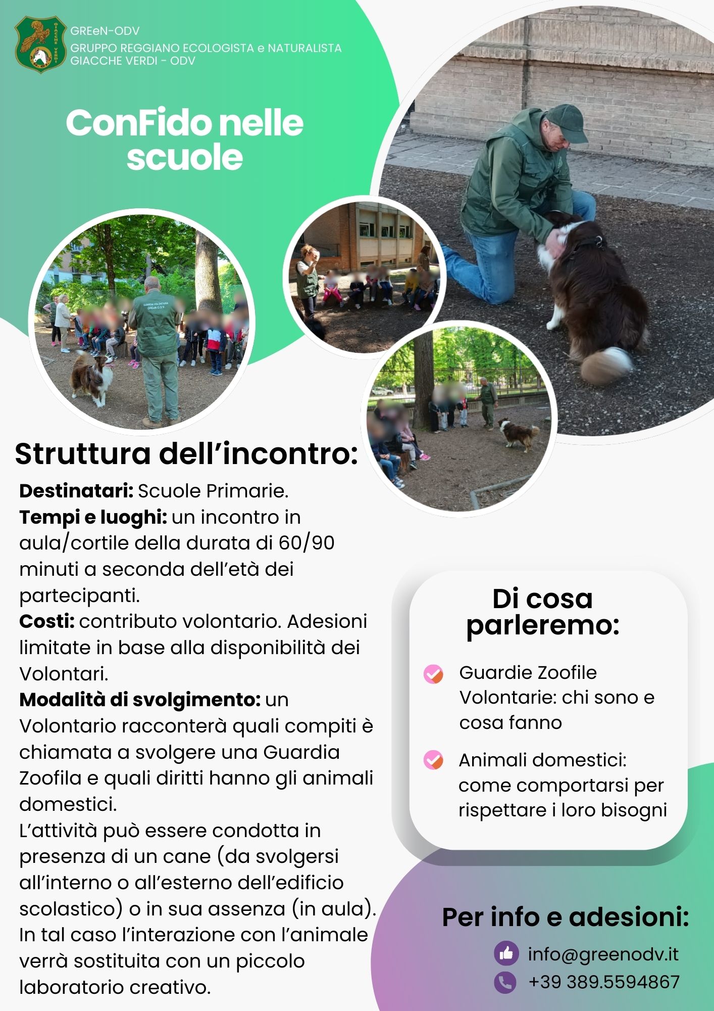 A tal fine, GREeN-ODV mette a disposizione volontari formati e specializzati e propone alle Scuole Primarie e Secondarie di Primo Grado tre tipologie di interventi, diversi per le tematiche affrontate: