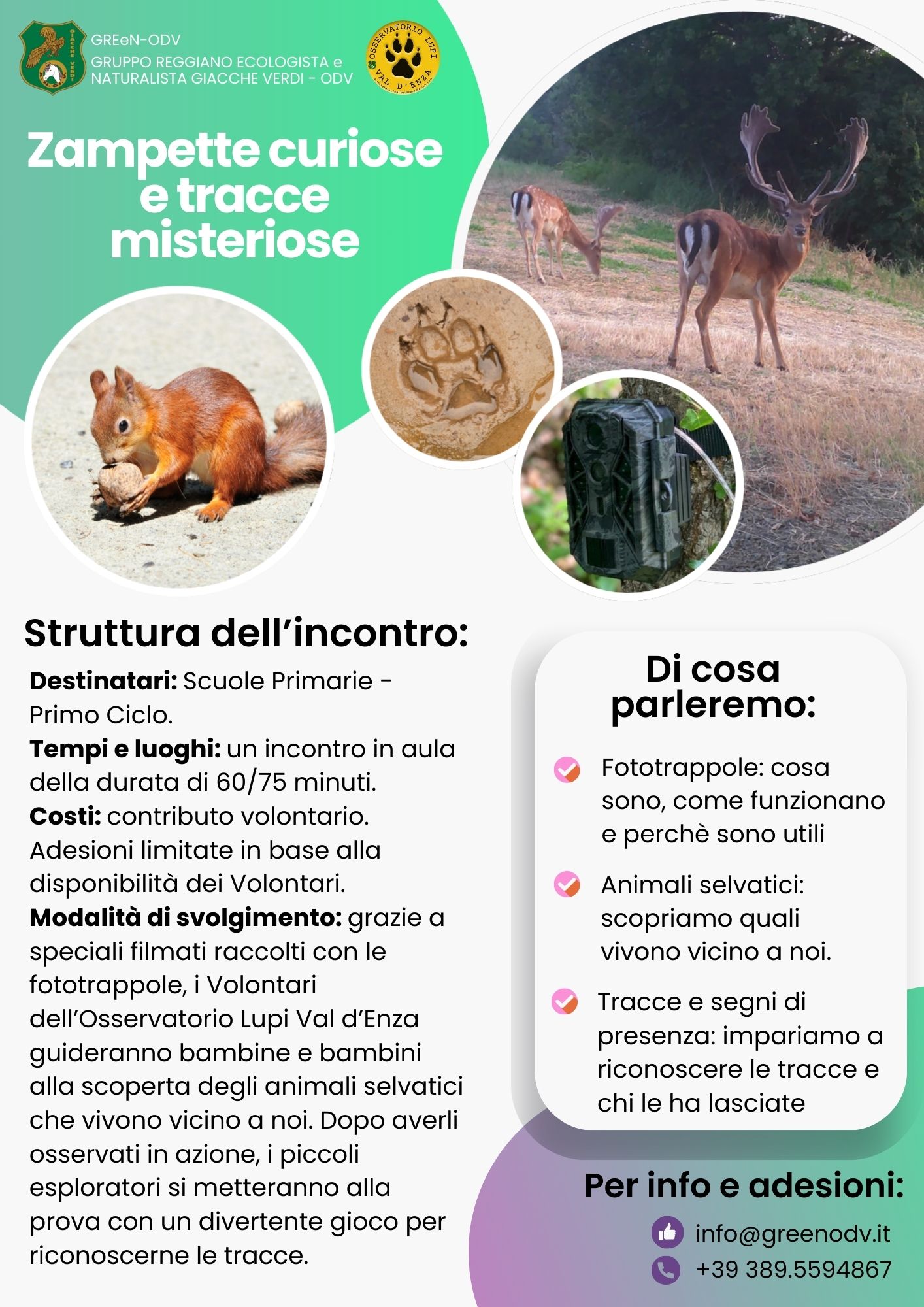 vuol far conoscere alle bambine e ai bambini la biodiversità che ci circonda. Attraverso alcuni filmati registrati da fototrappole, potranno osservare da vicino le abitudini degli animali selvatici e imparare a riconoscerli. Dopo la visione, l'esperienza continuerà con un gioco a squadre divertente e coinvolgente, attraverso il quale scopriranno che la natura parla attraverso piccoli indizi, che basta imparare a leggere. L'intervento sarà condotto da volontari di GREeN-ODV e dell'Osservatorio Lupi Val d'Enza.