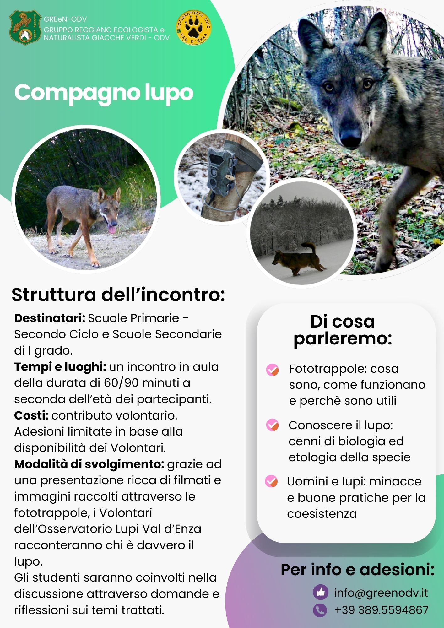 che mira a far conoscere l'etologia e le abitudini di vita di questo predatore, senza tralasciare le relazioni con le altre specie animali e, in particolare, con l'uomo, allo scopo di sensibilizzare le nuove generazioni e porre con loro le basi per una corretta coesistenza. L'intervento sarà condotto da volontari dell'Osservatorio Lupi Val d'Enza, realtà facente parte di GREeN-ODV, che dal 2018 si occupa del monitoraggio di questa specie, nelle Province di Parma e Reggio Emilia.